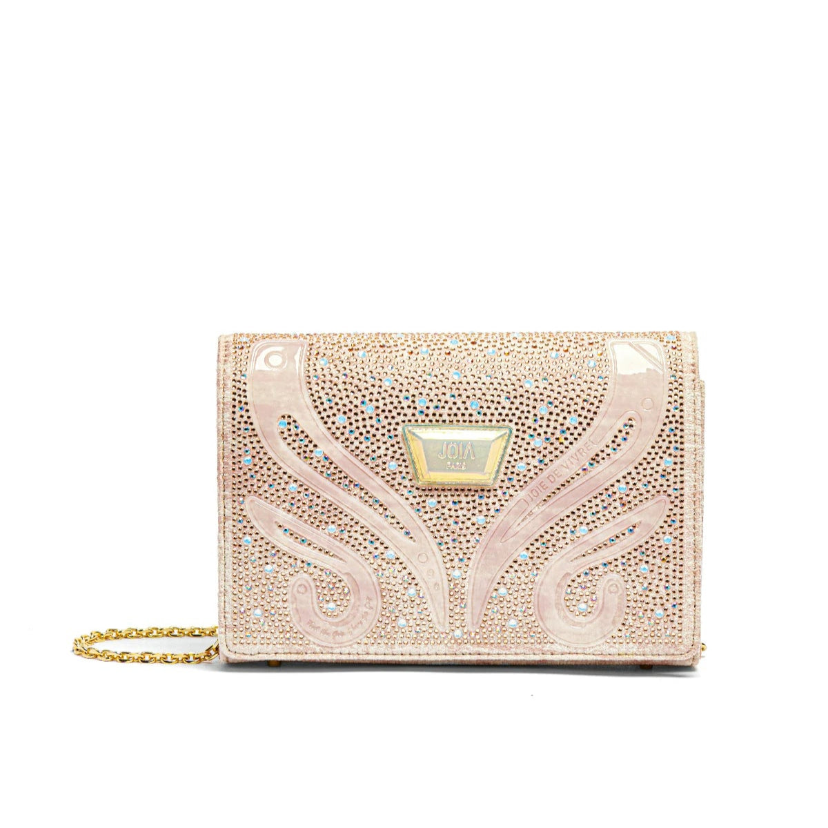 This elegant JOIAPARIS clutch combines Parisian chic with modern glamour. Crafted in a soft blush tone, it features intricate crystal embellishments and a subtle swirling pattern that catches the light beautifully. The front is adorned with the JOIAPARIS metallic logo plate, adding a touch of sophistication. A fine gold chain allows for versatile wear as a shoulder bag or clutch, making it the perfect accessory for evening events, parties, or special occasions.